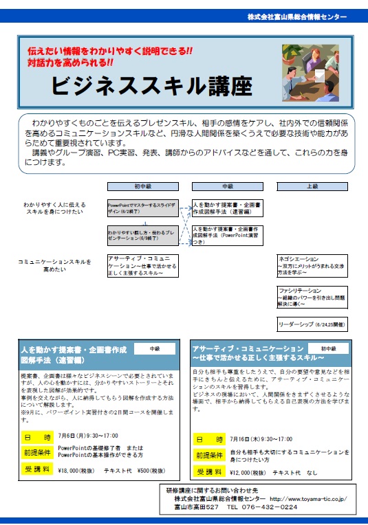 ■コミュニケーション力は研修で高められます わかりやすくものごとを伝えるプレゼンスキル、顧客やスタッフとの信頼関係を深めるコミュニケーションスキルなどは、技術を学んで実践することで身につけることが可能です。様々な場面で活用できる講座を開催します。