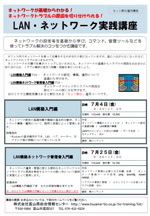 ※「LAN構築入門編」とセットで受講されると割引になるセット割引適用コースです