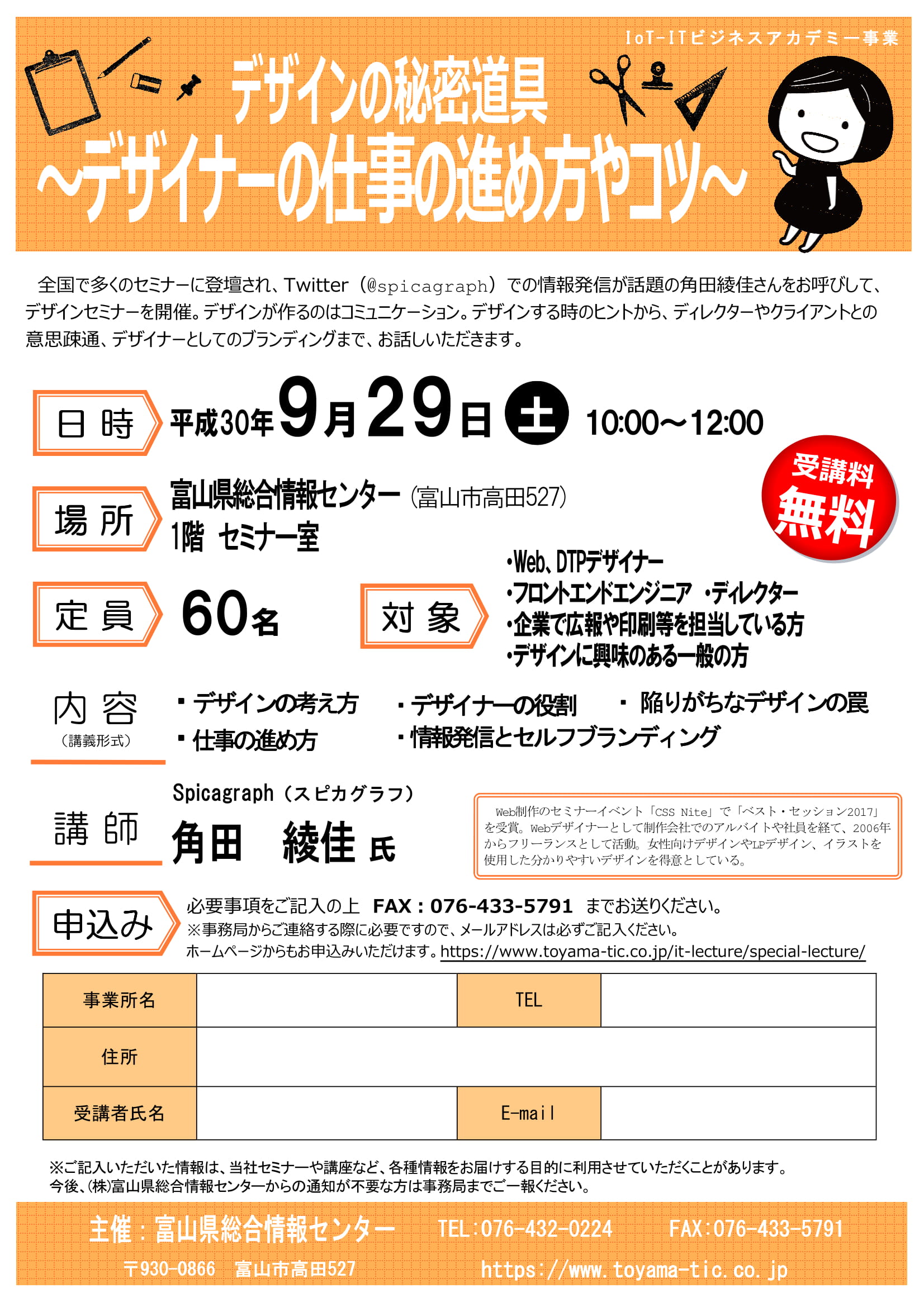全国で多くのセミナーに登壇され、Twitter(@spicagraph)での情報発信が話題の角田綾佳さんをお呼びして、デザインセミナーを開催します。