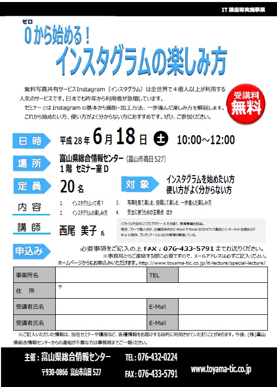 セミナーではInstagramの基本から撮影・加工方法、一歩進んだ楽しみ方を解説しますので、これから始めたい方や始めたけれども使い方がよく分からない方にもおすすめです。