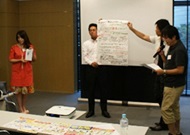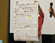 会場では5人程度のグループを作り、実際に集めたアンケートを利用して集計・分析を行い、その結果を元に広告の構成やキャッチコピーを作成。