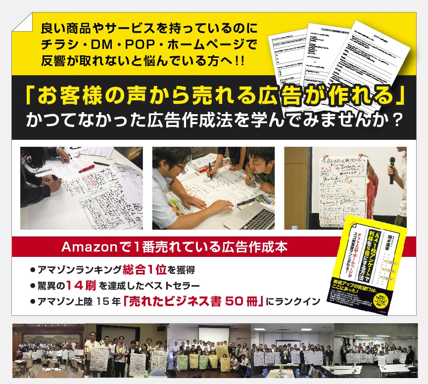 販促コンサルタントの岡本達彦氏 著書 『「A4」1枚アンケートで利益を5倍にする方法』のなかで紹介している理論を基に、チラシやホームページなどの「売れる広告」のラフ原稿を作成実践していただきます。