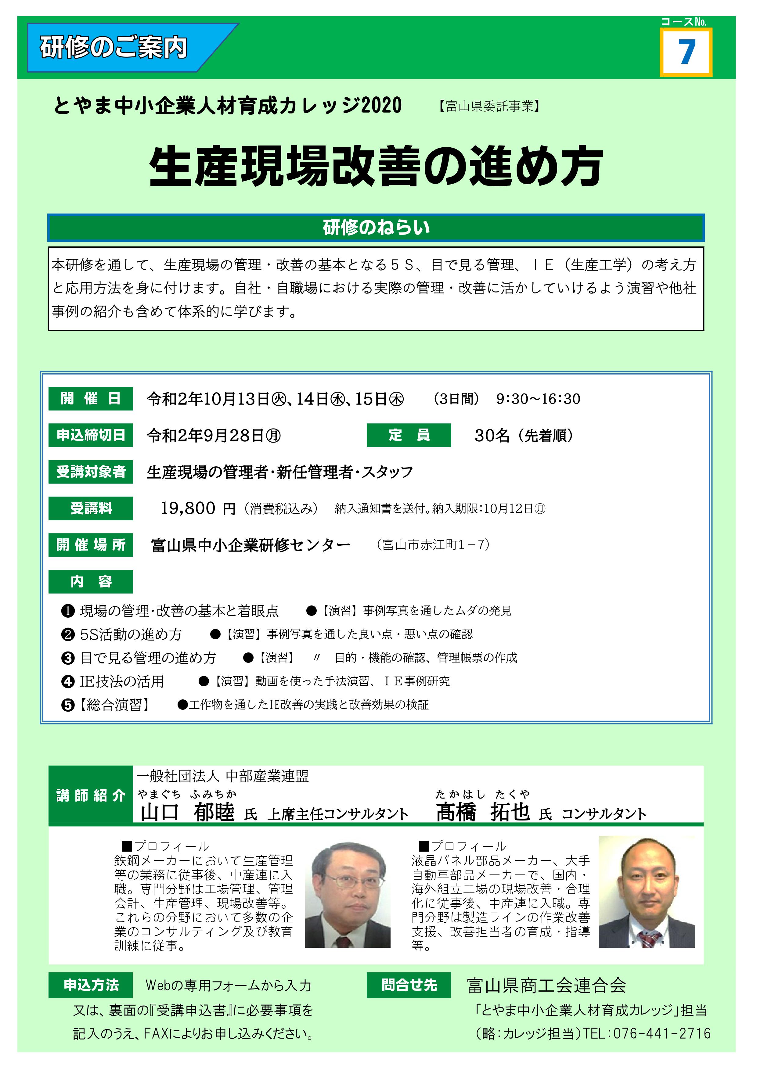 とやま中小企業人材育成カレッジ2020 7⃣「生産現場改善の進め方」