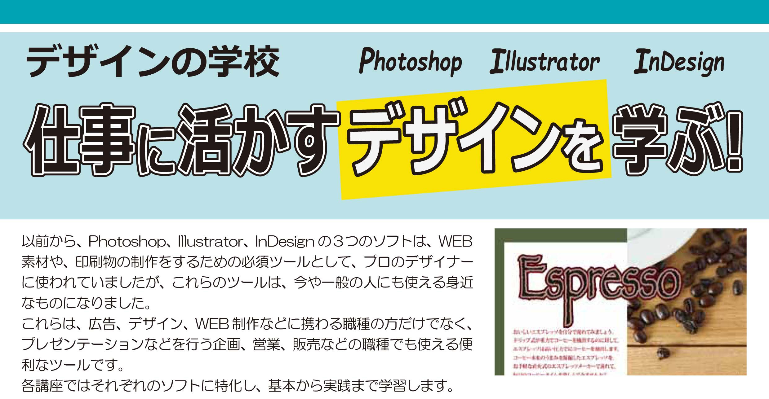以前から、WEB素材やアニメーション、印刷物の制作をするための必須ツールとして、Photoshop、Illustrator、InDesignの3つのソフトは、プロのグラフィックデザイナーに使われていましたが、これらのツールは、今や、一般の人にも使える身近なものになりました。
